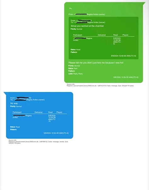 She also asked whether Gonzales had hired her because of her appearance, which he denied. When Gonzales pressed further with an explicit sexual question, Santos-Aviles pushed back again, writing: “never.”