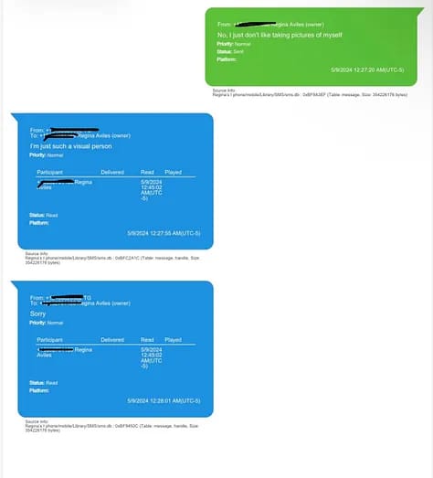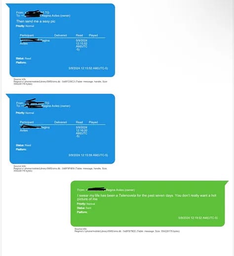 The messages show the exchange beginning around midnight in May 2024, with Gonzales asking Santos-Aviles to send him a “sexy pic.” She deflected, writing that her “life has been a Telenovela for the past seven days” and that he didn’t “really want a hot picture” of her. When Gonzales responded that he was “just such a visual person,” Santos-Aviles declined again, saying she didn’t like taking pictures of herself.